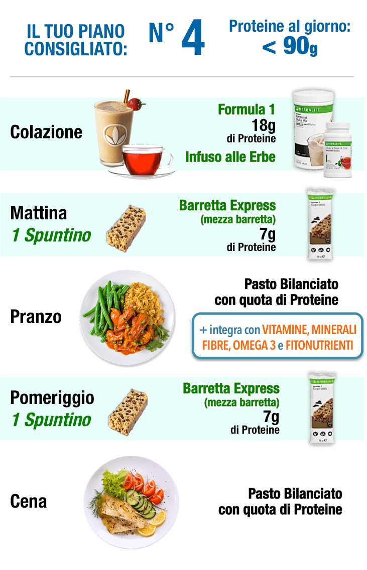 usa i prodotti a COLAZIONE e come SPUNTINI (a 1/2 mattino e a 1/2 pomeriggio) - Così facendo, eviterai di mangiare a colazione prodotti ricchi di zuccheri ma poveri di proteine e, durante la giornata, snack poco sani, calorici e poveri di nutrienti. - Usando i prodotti Herbalife a COLAZIONE e come SPUNTINI, fornisci al tuo corpo tanti nutrienti con pochissime calorie. Non solo: ottieni una quota di proteine sane e ciò aiuta a sostenere il metabolismo, stimolando il corpo a mantenere un eccellente livello di vitalità. - Inoltre, l’apporto di nutrienti dei prodotti ti permette di non arrivare sfinito al pasto successivo, aiutandoti così a mantenere abitudini alimentari sane, in ogni circostanza!
