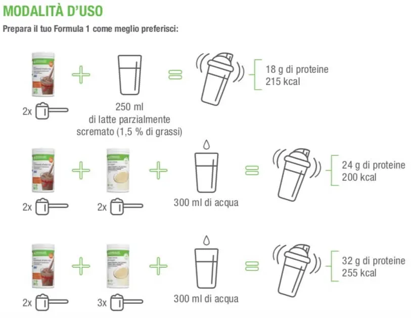 Una porzione di Formula 1 Herbalife Biscotto Croccante si ottiene frullando o miscelando con uno shaker 26g di prodotto (2 cucchiai colmi da minestra) in 250ml di latte parzialmente scremato (o scremato) oppure 250ml di latte di soia.